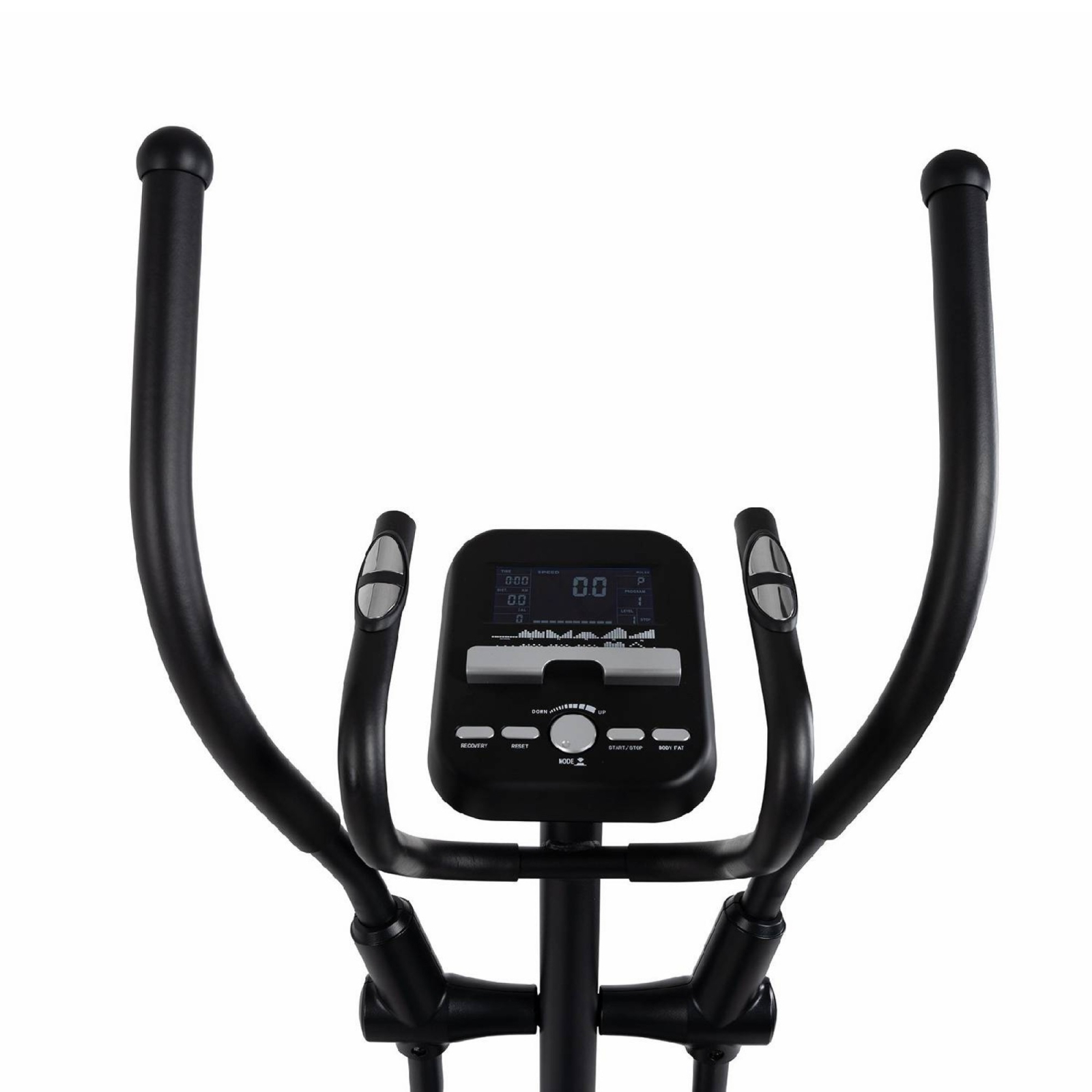 Consola LCD afiseaza clar toate datele esentiale – timp, distanta, viteza, calorii si puls – si ofera 12 programe variate de antrenament, inclusiv moduri cu obiective prestabilite (timp, distanta, calorii) si 4 programe controlate de ritmul cardiac. Masurarea pulsului se face prin senzorii manuali integrati sau, pentru o acuratete sporita, cu ajutorul unei centuri toracice disponibile optional.